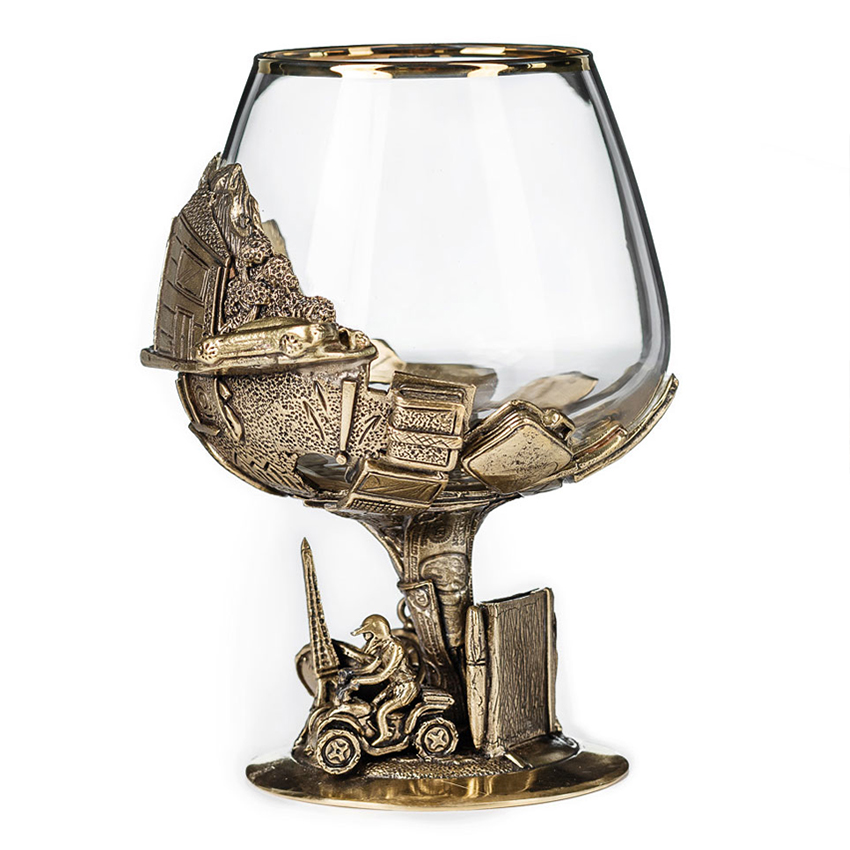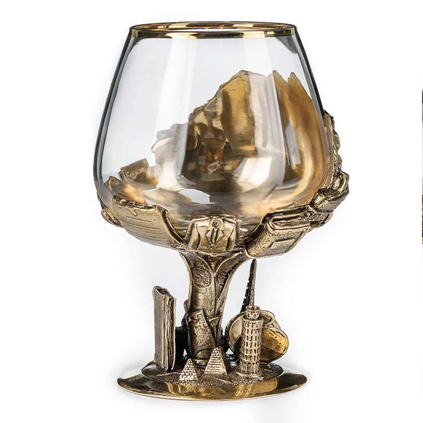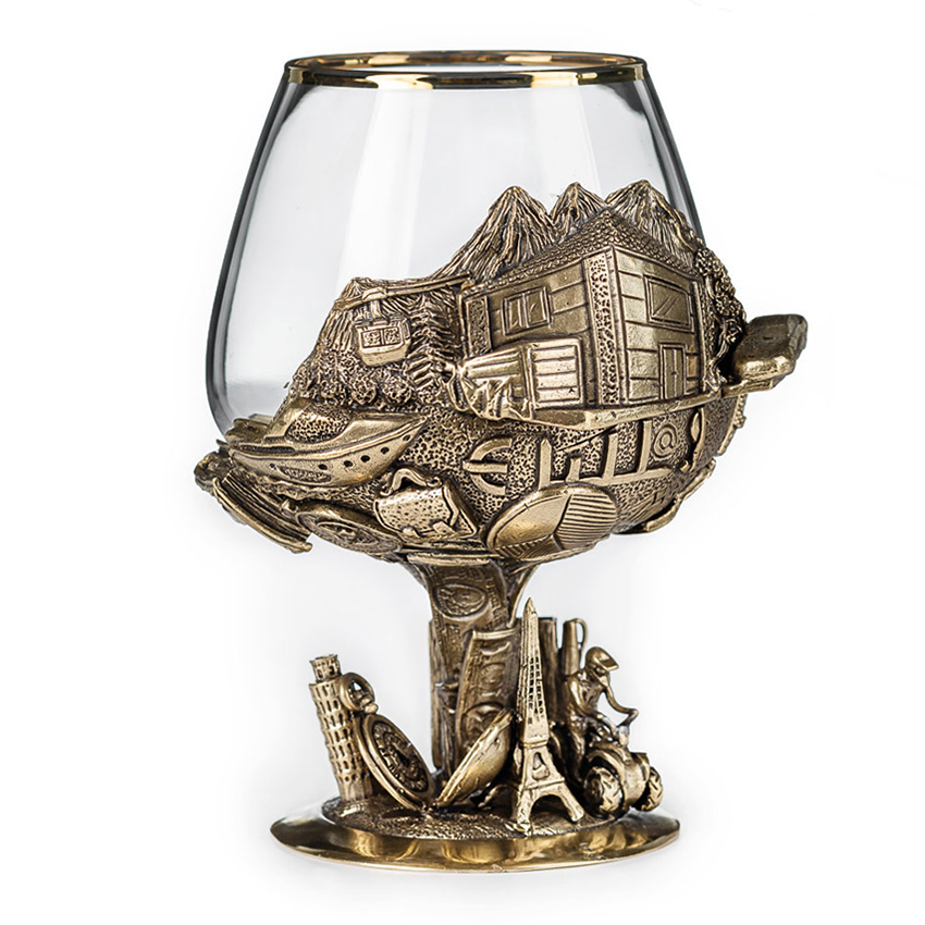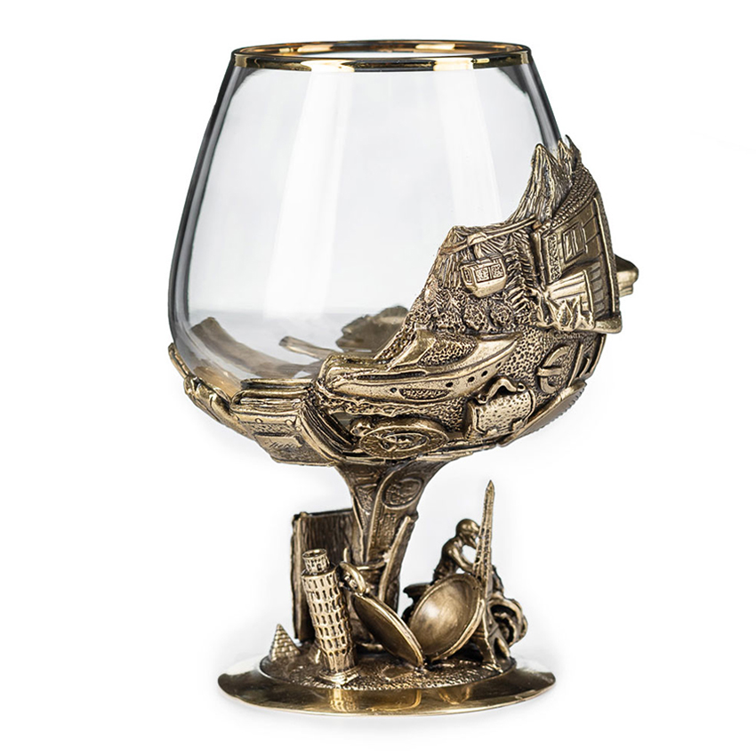 Вау-эффект вызывает латунное основание бокала, на котором изображены атрибуты благополучной частной и деловой жизни успешного человека - автомобиль премиум-класса, яхта, шале, горнолыжный курорт, деньги, дорогие деловые аксессуары и одежда, мировые достопримечательности – египетские пирамиды, Пизанская и Эйфелева башни. Интересно рассматривать, весело дарить!
