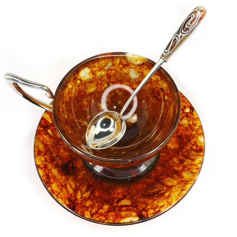 Чайная пара "Модерн" произведена из балтийского янтаря по уникальной, единственной в мире технологии, позволяющей максимально сохранить его первозданность. Её суть состоит в спекании отдельных камешков янтаря в единое целое. Именно в спекании, а не в плавке, когда расплавленный до жидкого состояния янтарь прессуется под большим давлением. При спекании кусочки янтаря соединяются между собой только по периметру посредством диффузии (без клеевых составов!), что позволяет полностью сохранить природный цвет, состав и свойства янтаря, а значит, ту неповторимую красоту, за которую этот теплый и живой камень высоко ценят во всем мире. И никаких добавок: как искусственных, так и натуральных!