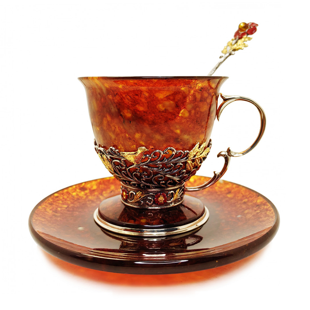 Чайная пара "Русские узоры" произведена из балтийского янтаря по уникальной, единственной в мире технологии, позволяющей максимально сохранить его первозданность. Её суть состоит в спекании отдельных камешков янтаря в единое целое. Именно в спекании, а не в плавке, когда расплавленный до жидкого состояния янтарь прессуется под большим давлением. При спекании кусочки янтаря соединяются между собой только по периметру посредством диффузии (без клеевых составов!), что позволяет полностью сохранить природный цвет, состав и свойства янтаря, а значит, ту неповторимую красоту, за которую этот теплый и живой камень высоко ценят во всем мире. И никаких добавок: как искусственных, так и натуральных!