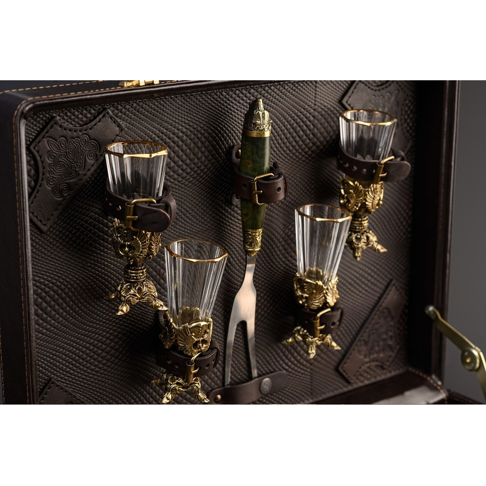 Рюмки для крепких напитков емкостью 50 мл вносят в набор дух русского барства. Классическая граненая форма рюмок сочетается с латунными подставками, выполненными вручную методом художественного литья. Горячительный напиток из такой рюмки под хорошую мясную закуску – лучше не придумать!