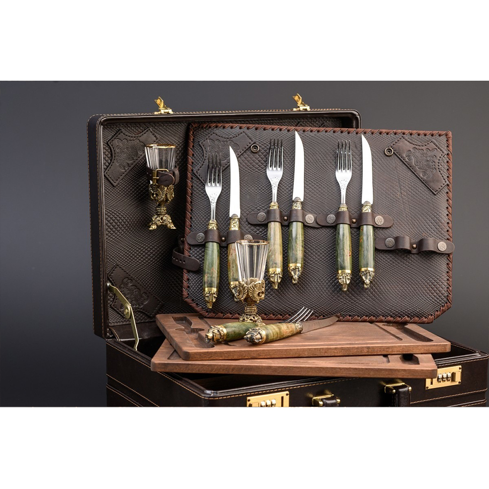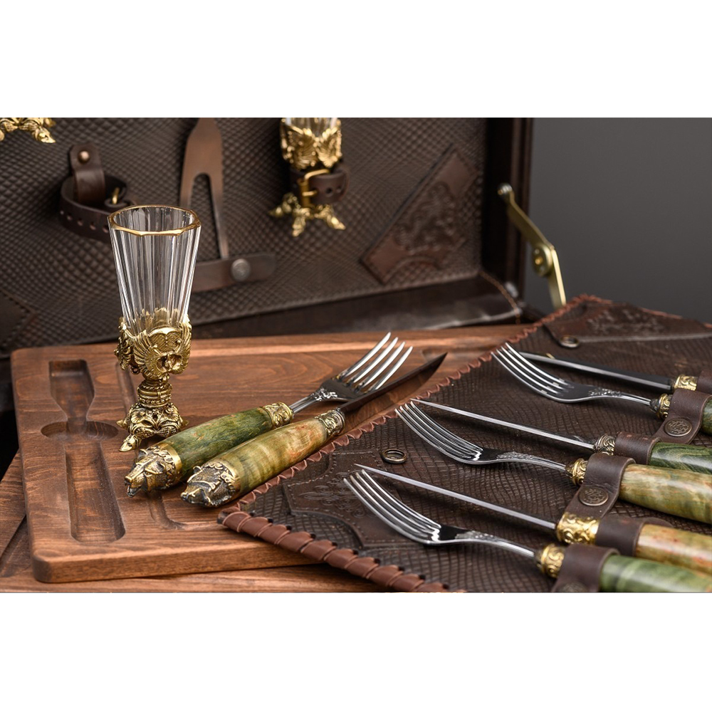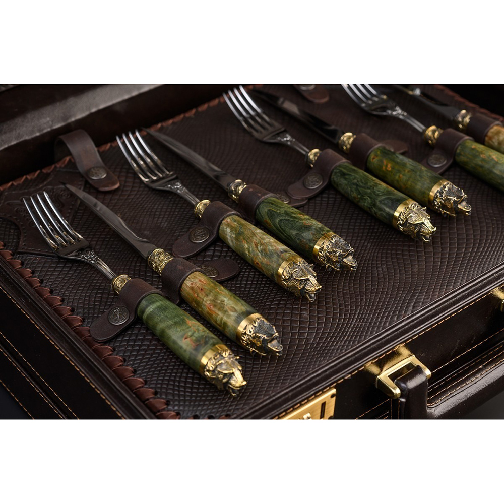 Столовые приборы - вилки и ножи - изготовлены из высококачественной нержавеющей стали и дополнены рукоятками из древесины карельской березы. Но главное украшение приборов – латунные навершия в виде голов диких животных, выполненные методом художественного литья.