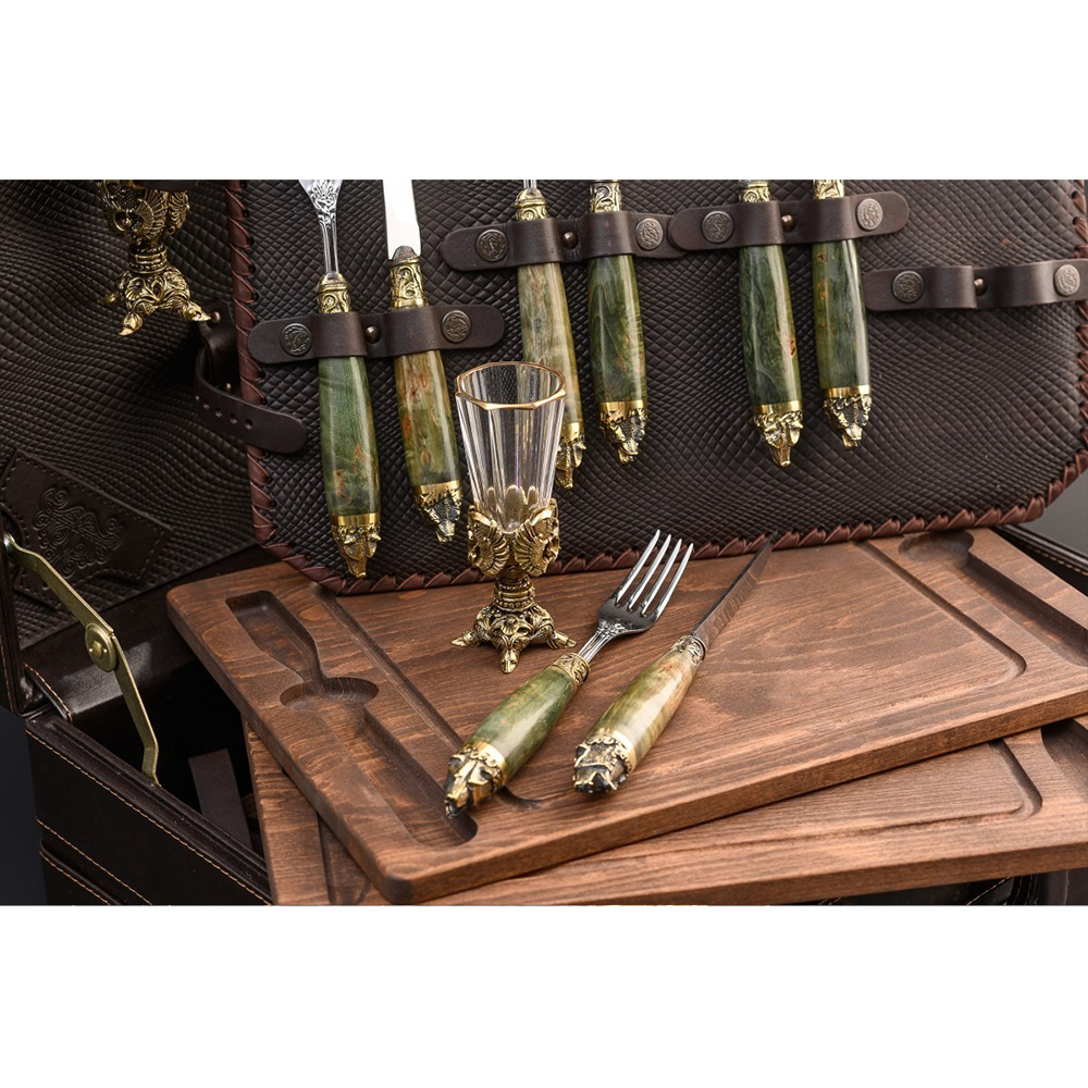 Комплект рассчитан на 4 персоны: каждому полагается деревянная доска для подачи и разделки своей порции мяса, нож, вилка и классическая рюмка.