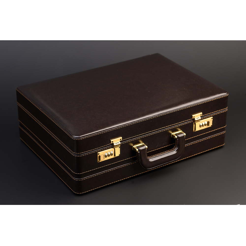 Солидный кейс – сдержанный и лаконичный, с качественной фурнитурой и контрастной отстрочкой, снаружи выполнен из экокожи, а внутри отделан натуральной тесненной кожей.