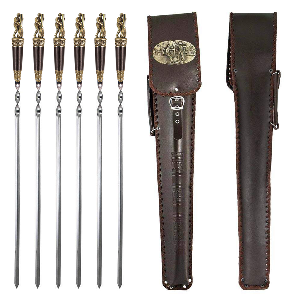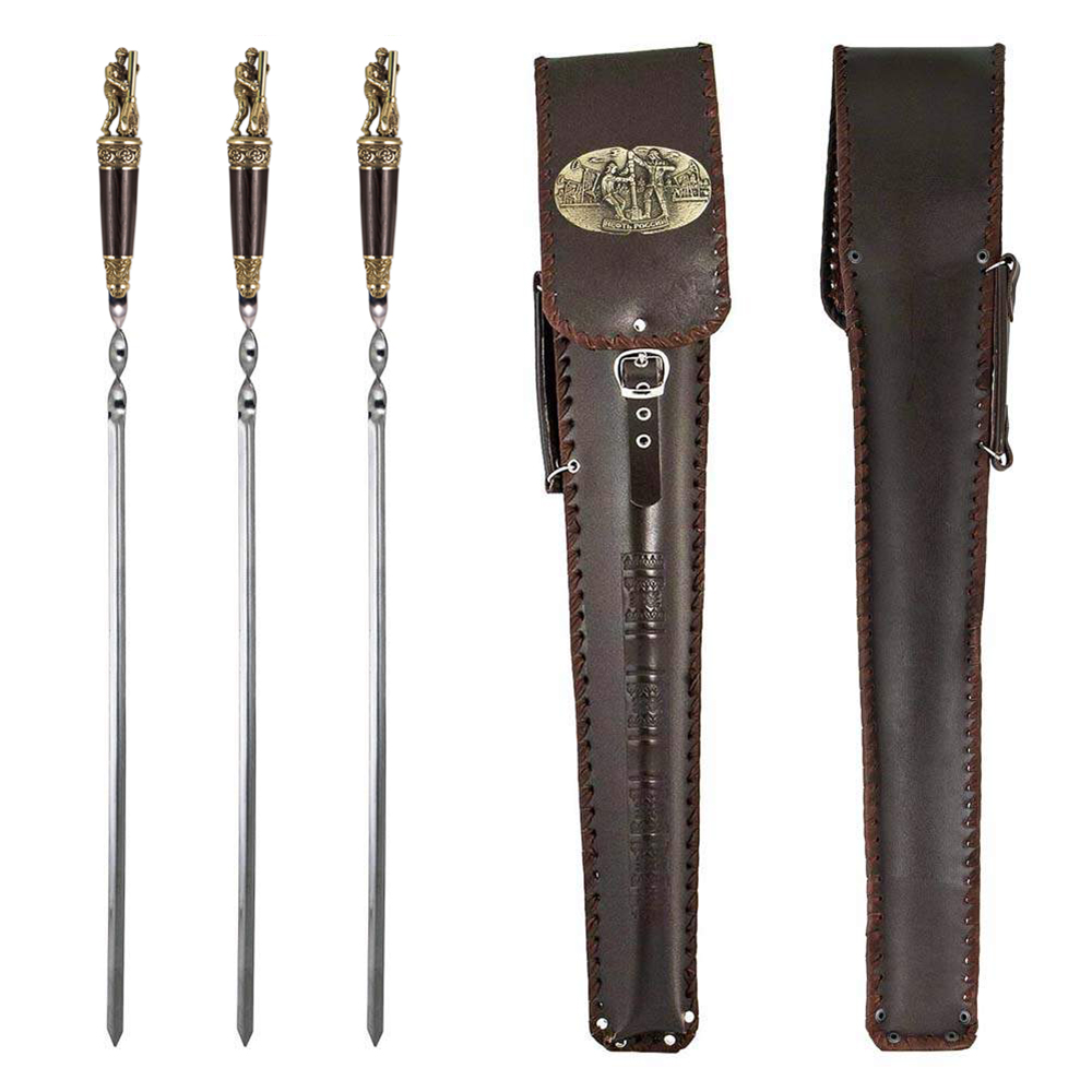 Материалы изделия: шампура - нержавеющая сталь, дерево венге, латунь; колчан- натуральная кожа с латунной накладкой.