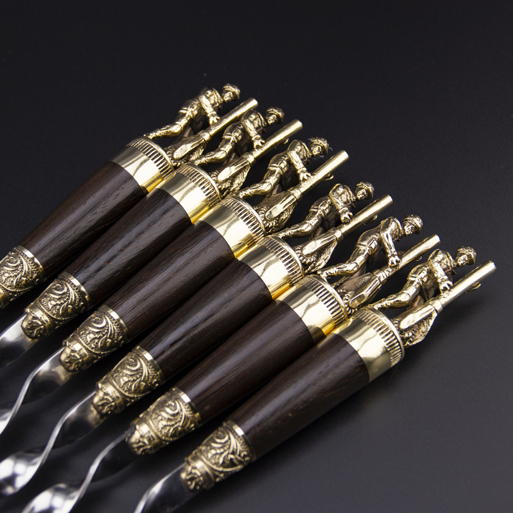 Шампуры из нержавеющей стали дополнены ручкой из древесины венге с латунным навершием: миниатюрная скульптура нефтяника исполнена вручную в технике художественного литья. Застёгивающийся на ремешок с пряжкой колчан сшит из первосортной натуральной кожи. Аксессуар ручной работы декорирован искусным тиснением и литой латунной накладкой со сценкой из жизни профессии.