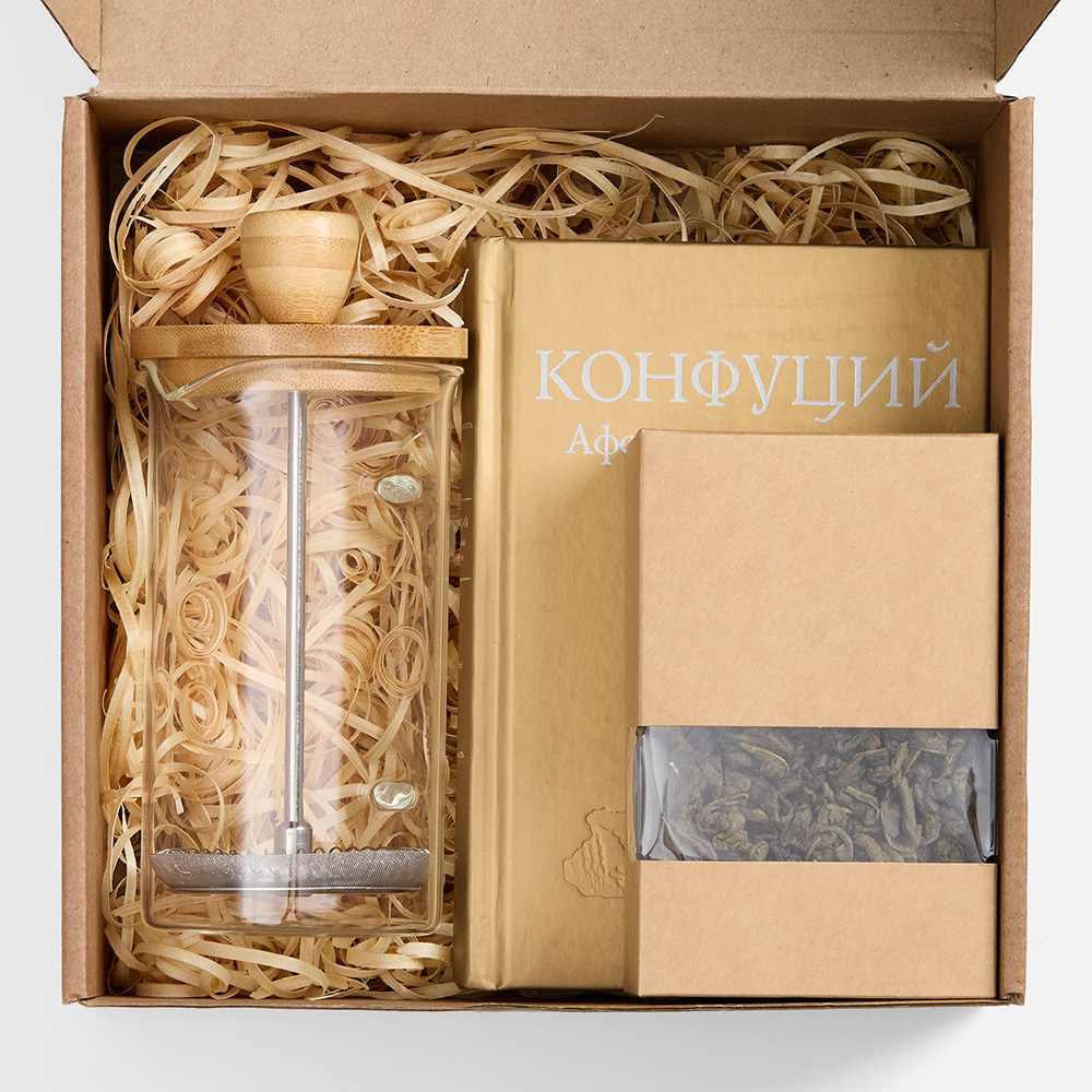 Размер подарка: книга - 17 х 12 см, чай - 50 г, френч-пресс - 350 мл, коробка - 21,5 х 20,5 х 10,8 см